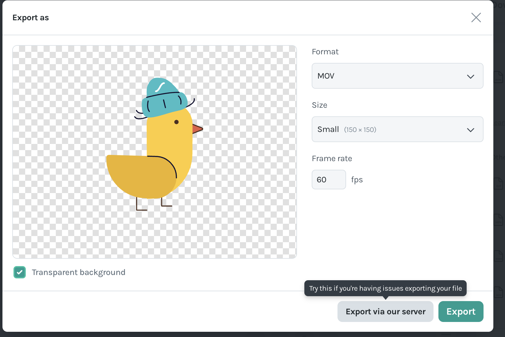 If your Lottie animations fail to export or have quality issues when converting to GIF or MP4, try the server-side export option.